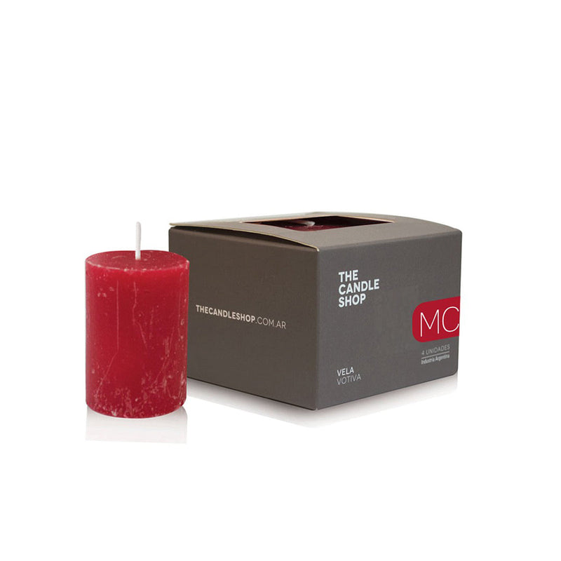 Vela votiva de 4 cm de diámetro y 5 cm de alto en caja de 4 unidades.