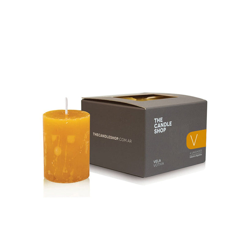 Vela votiva de 4 cm de diámetro y 5 cm de alto en caja de 4 unidades.